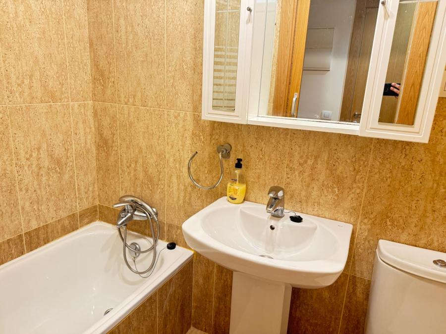 La superficie está repartida en 2 dormitorios, un salón de 16 metros, cocina amueblada con electrodomésticos y 2 baños completos (uno con ducha y otro con bañera).