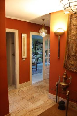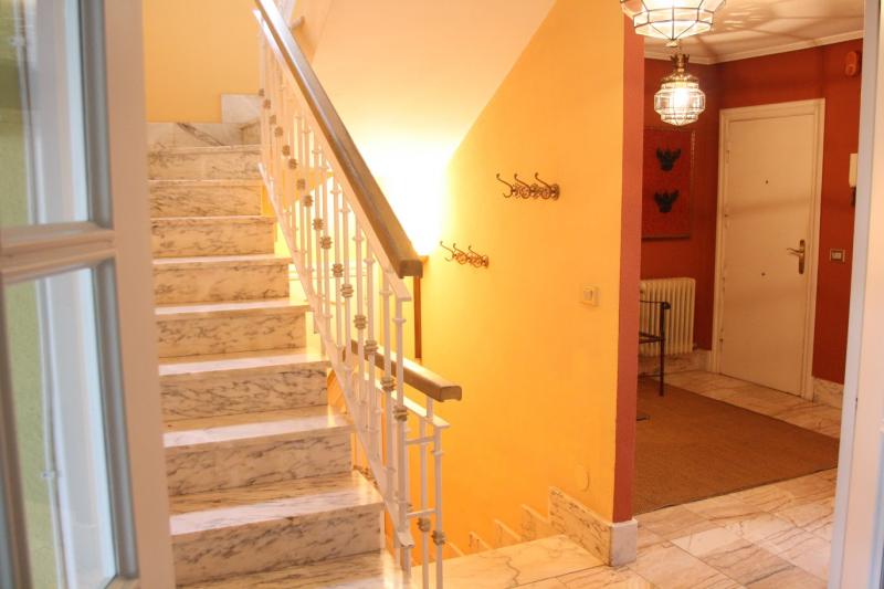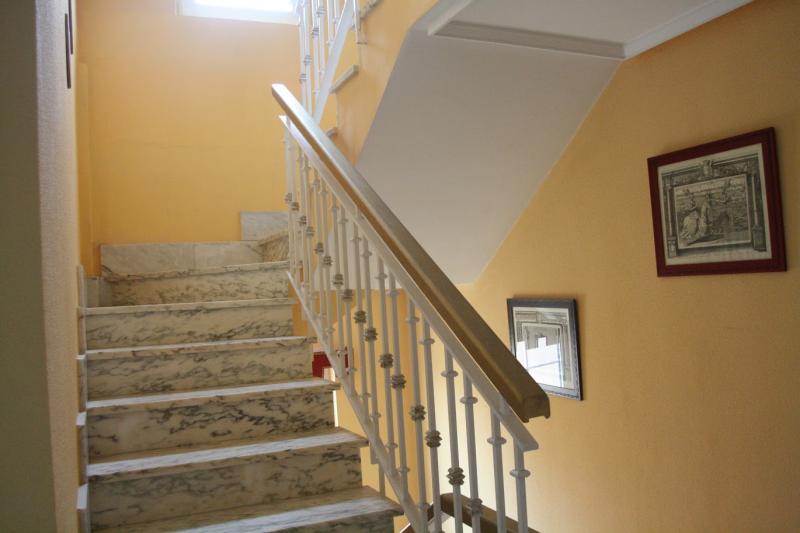 La escalera es de mármol con lateral de forja y pasamanos de madera.