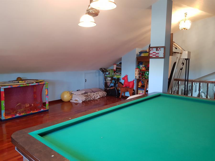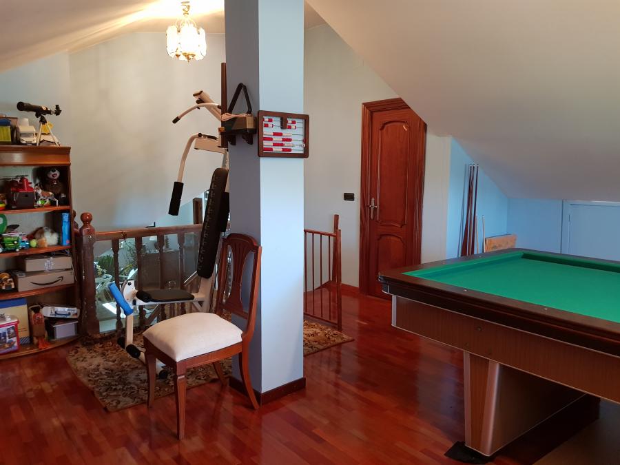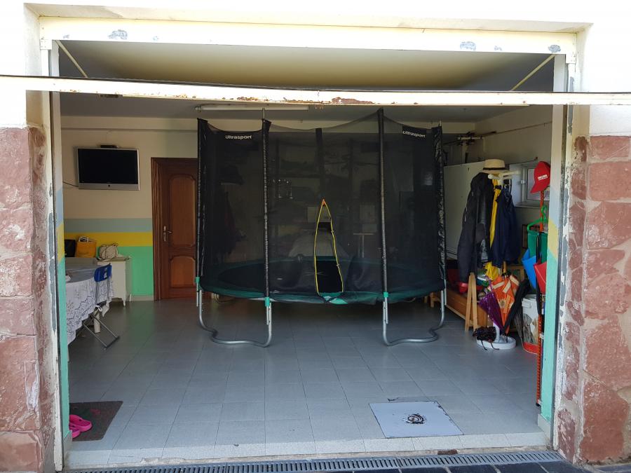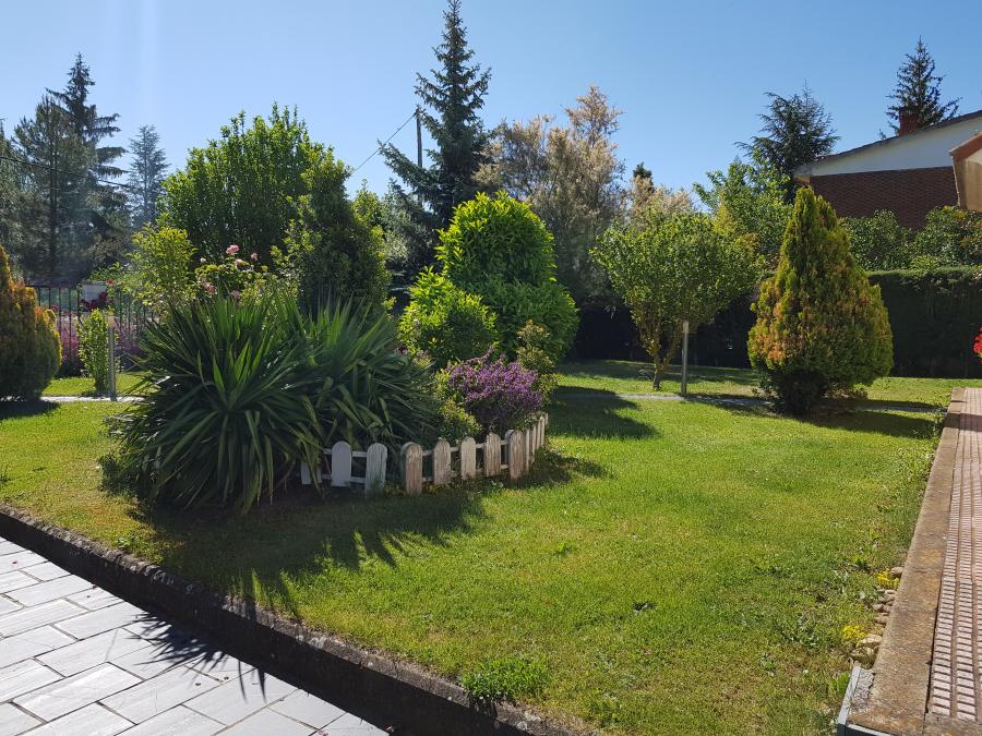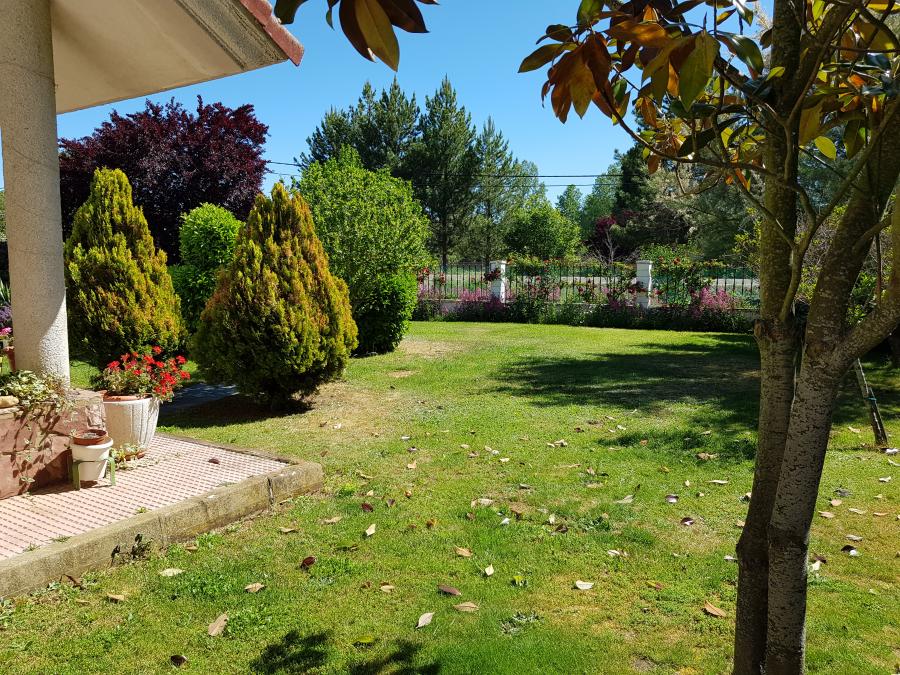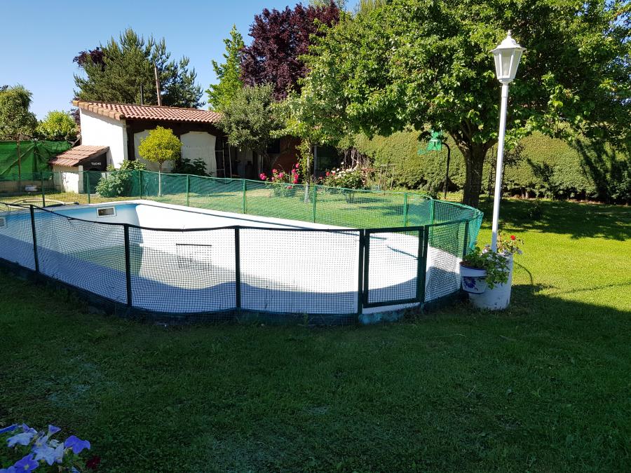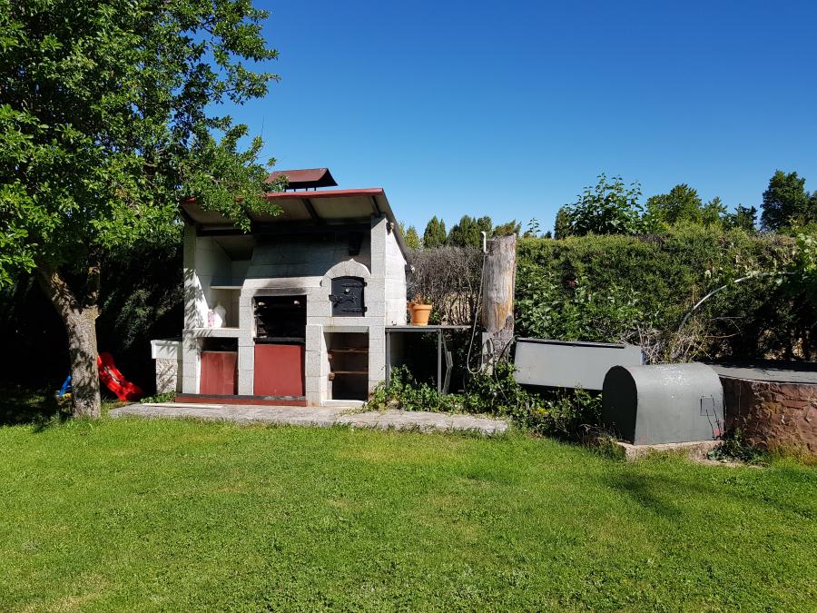El enorme jardín con piscina tiene espacio de sobra para que disfrutes de todas las actividades de ocio que se te ocurran al aire libre. Aparte, tiene zona de barbacoa, una edificación que usan como taller y la parte de la leñera.